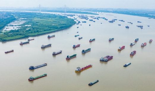 2024年6月1日,船舶在湖北武漢陽邏港區(qū)水域行駛(無人機照片)。新華社記者 杜子璇 攝