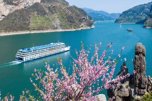2025年3月19日,船舶行駛在長江三峽西陵峽湖北省宜昌市秭歸縣水域,岸上桃花綻放(無人機照片)。新華社發(fā)(鄭家裕 攝)