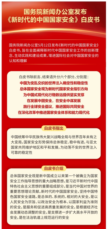 國務院新聞辦公室5月12日發布《新時代的中國國家安全》白皮書,旨在全面闡釋新時代中國國家安全工作的創新理念、生動實踐和建設成果,增進國際社會對中國國家安全的認知和理解。