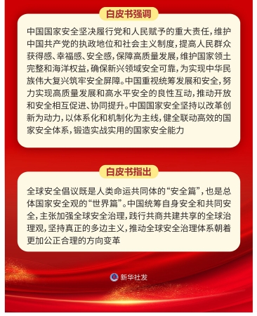 白皮書強調,中國國家安全堅決履行黨和人民賦予的重大責任,維護中國共產黨的執政地位和社會主義制度,提高人民群眾獲得感、幸福感、安全感,保障高質量發展,維護國家領土完整和海洋權益,確保新興領域安全可靠,為實現中華民族偉大復興筑牢安全屏障。中國重視統籌發展和安全,努力實現高質量發展和高水平安全的良性互動,推動開放和安全相互促進、協同提升。中國國家安全堅持以改革創新為動力,以體系化和機制化為主線,健全聯動高效的國家安全體系,鍛造實戰實用的國家安全能力。